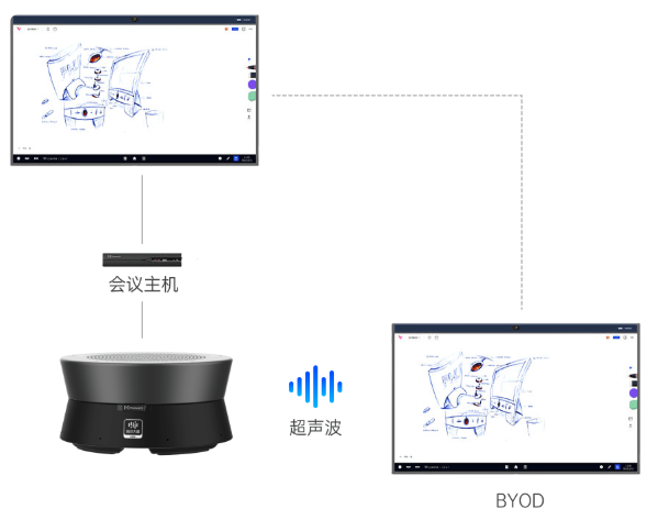 同时支持配合会议平台,可实现超声波投屏功能,能够让用户随时随地无线分享个人资讯如汇报材料、操作文档、案例分享等到大屏上,灵活高效,实现协作零负担