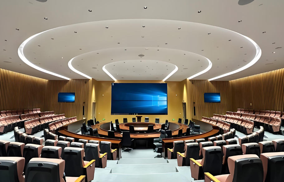 灯光控制器收到,立刻执行。会议室的灯光明亮起来。
