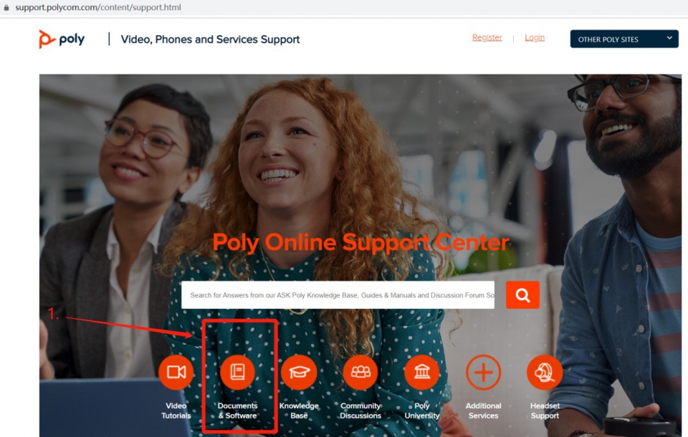 1.通过浏览器访问support.polycom.com网址,(由于是国外网址,进入比较缓慢),进入之后选择Documents & Software(文件与软件),如图所示: