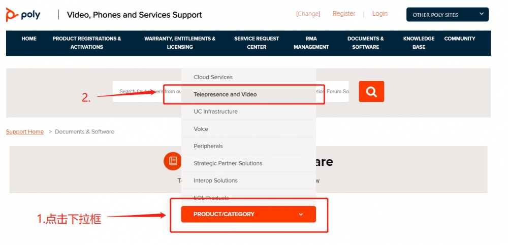 2.进入Documents & Software(文件与软件)页面点击PRODUCT/CATEGORY(产品/类别)下拉框,随后选择telepresence and video(远程监控和视频),如图所示:
