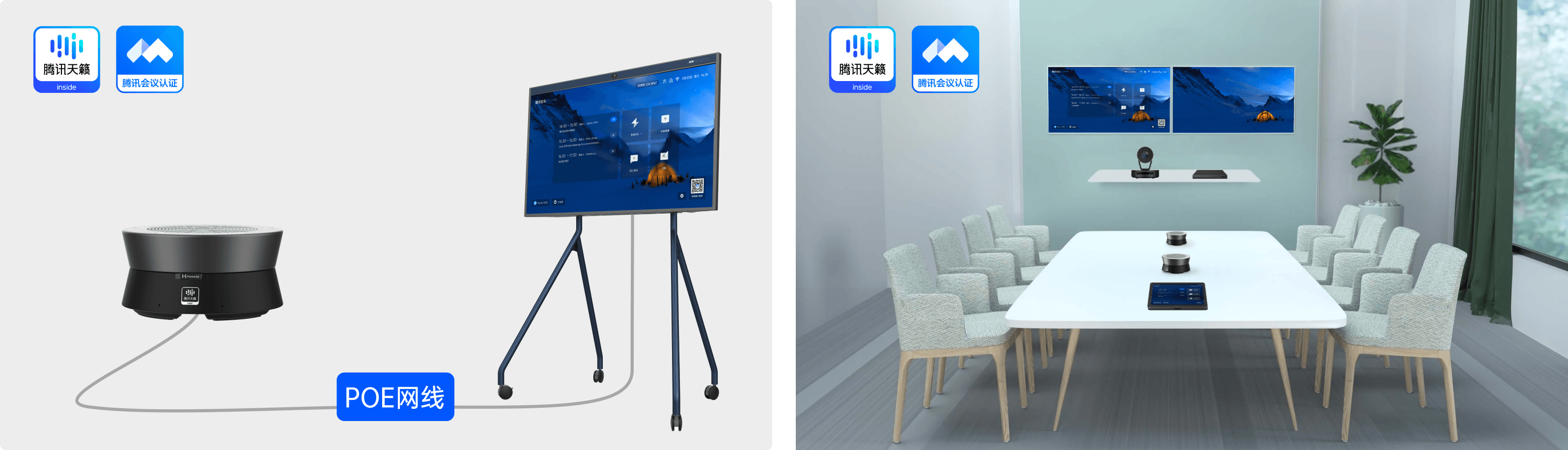 授权搭载腾讯天籁inside分布式音频级联技术,通过POE网线最多可支持8台设备同时连接,实现分布式拾扩音:同时分别支持腾讯会议认证的会议主机、会议摄像头、用户自带设备和腾讯天籁生态会议平板