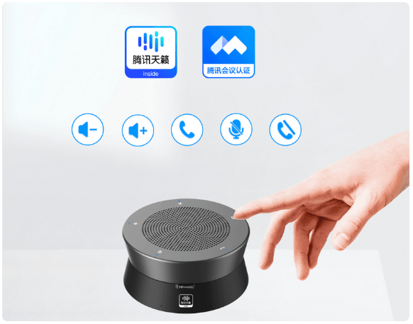 A21T面板按键与腾讯会议客户端、Rooms端以及认证的天籁款会议平板实现了完美联动,静音音量+、音量-、接听、挂断,每一个会议控制操作均可通过在桌面上的任意麦克风即能完成,无需进行从座位到会议平板的反复移动。
