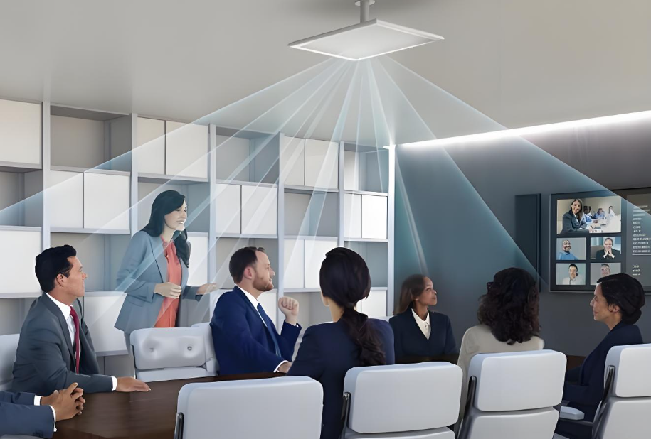 原来的麦克风像个“小蘑菇”一样蹲在桌子正中间,开会时大家得围着它坐。现在麦克风直接嵌在天花板里,或者吊装下来一个小圆球,颜色还是白的,不仔细看根本发现不了 。桌面清清爽爽,就剩一个水杯和笔记本,这才叫极简办公嘛。