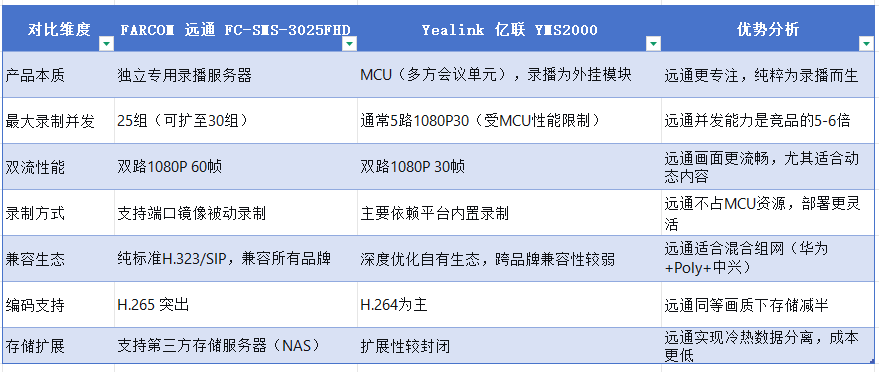 在录播服务器市场中,亿联YMS2000(MCU内置录播)与FARCOM远通FC-SMS-3025FHD(专用录播服务器)常被放在一起比较。以下是详细对比。核心参数与功能对比性价比场景对比测评结论:如果您是系统集成商或已有MCU的大型企业,需要高并发、跨品牌录制,FARCOM远通FC-SMS-3025FHD凭借25路并发、端口镜像、H.265编码和成本优势,是更具性价比的选择。