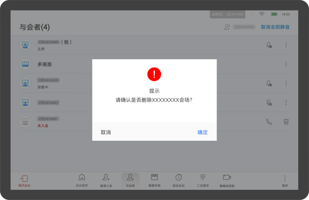主席可以删除某个未接入的会场。删除成功后,与会者列表中将不会再显示该会场。